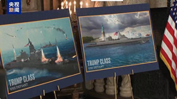 12月22日,好意思国总统特朗普在海湖庄园新闻发布会上展示了标有“特朗普级”“丧胆”号的新艨艟海报(央视新闻视频截图)